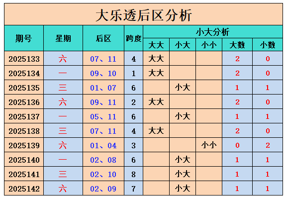 最近10期后区大小比为13:7,最近10期后区大大组合开出4期,小大组合开出5期,小小组合开出1期。上期开出小大组合,本期看好小小组合出现。