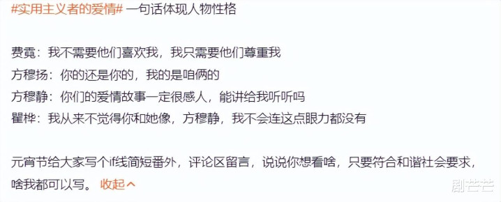 原著《实用主义的爱情》作者概括的四人形象,费霓是清醒的,不需要用大价钱请客吃鱼,换取喜欢,她喜欢用实际行动证明自己。