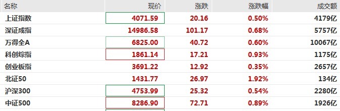 截至发稿,沪指涨0.5%,深证成指涨0.68%,创业板指涨0.35%,北证50大涨近2%。全市超3400只个股飘红。