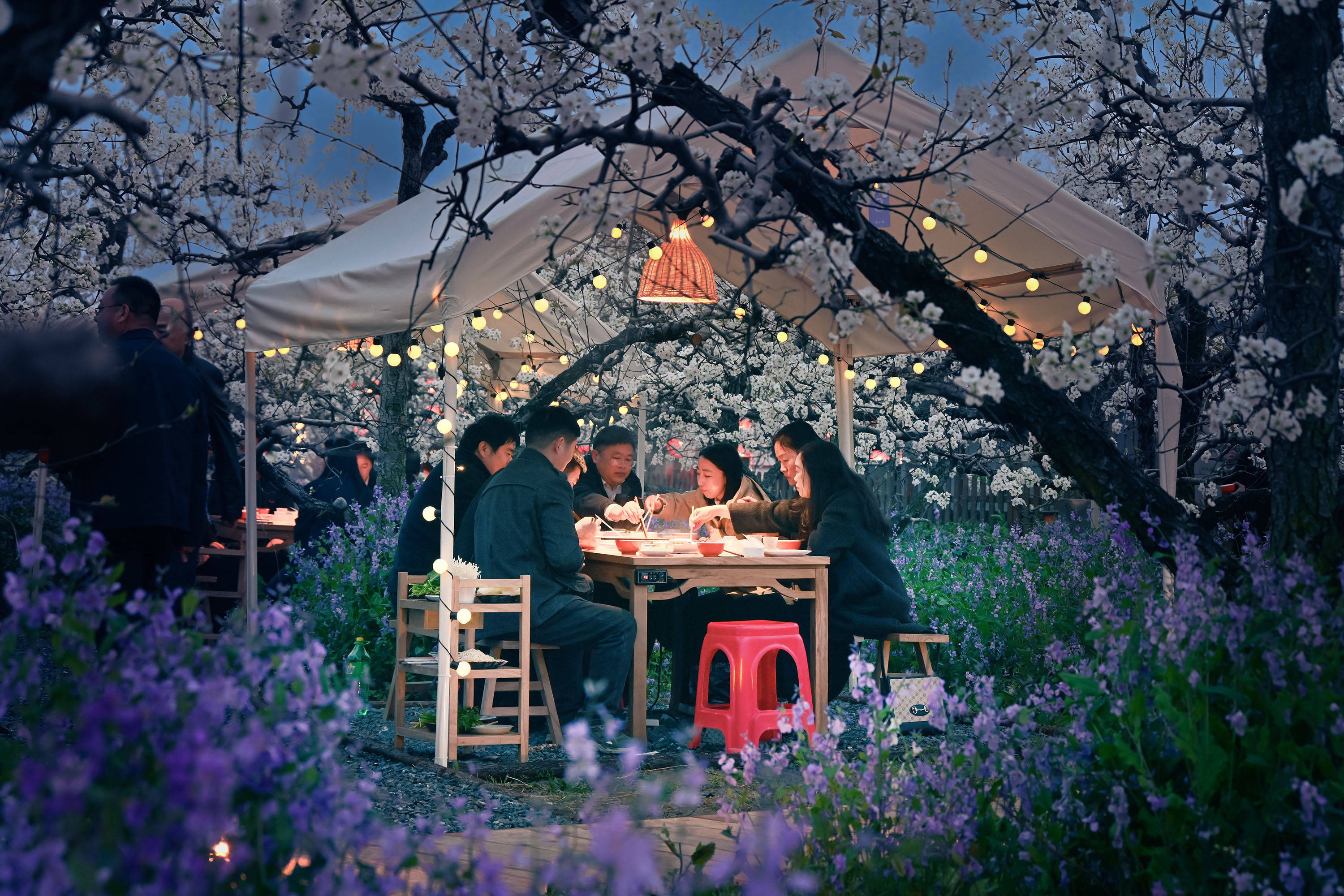 游客在安徽宿州砀山县梨小萌欢乐梨园品尝梨园火锅。新华社发(崔猛 摄)“赏花经济正围绕美食、演艺、非遗、夜游、民宿、文创、体育和康养等业态拓展消费场景,延长产业链条。”中国旅游研究院政策与科教所助理研究员韩晋芳介绍,年轻人偏好妆造打卡、时尚专场和数字化表达,中年群体往往更关注夜游演艺等内容,高收入人群则更倾向于深度游和跨省“追花”。